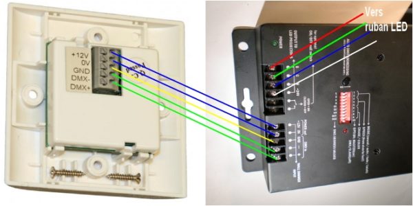 Ce schéma vous indique comme faire les branchements électriques de votre kit LED Strip. Le boitier mural ici…